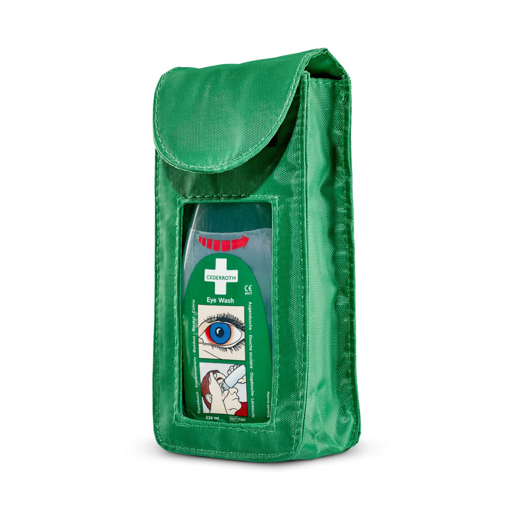 Zöld színű övtáska a Cederroth 235 ml-es szemkimosó palackhoz. Megvédi a flakont a külső szennyeződésektől, biztonságosan és higiénikusan tárolható benne a szemkimosó Az övtáska elülső oldala átlátszó, a hátoldalán egy övhurok található, melynek vízszintes és függőleges nyílásai is vannak.