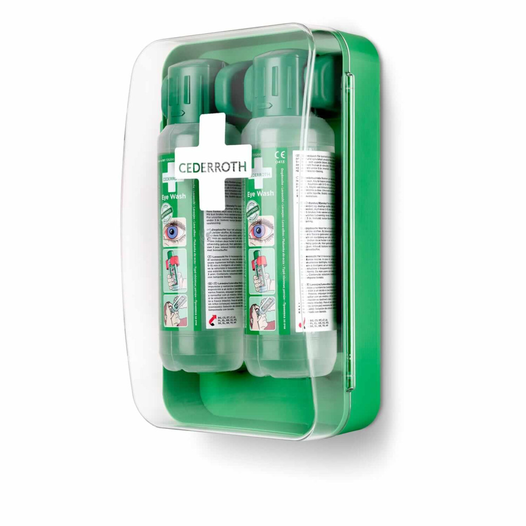 Kompakt, por- és vízálló szemkimosó állomás két flakon Cederroth borátos szemkimosóval. Könnyen elfér még kis helyen is. Az átlátszó fedél védi a palackokat a portól, szennyeződésektől, víztől, és segíti a könnyű áttekinthetőséget. A palackok automatikusan kinyílnak a tartóból való kicsavaráskor, lehetővé téve az azonnali öblítést. A szekrény bármilyen függőleges felületre felszerelhető, pl. falra, járműre vagy akár laboratóriumi asztalra. A szemkimosó palackok orvostechnikai eszközök, CE-jelöléssel rendelkeznek. Fluoreszkáló használati utasítás táblával. A zöld színű műanyag >64%-ban újrahasznosított műanyagból készült. Tökéletes poros és piszkos munkahelyekre, ahol kiemelt a kockázatot jelent a szembaleset veszélye, vagy korlátozott hely esetén.