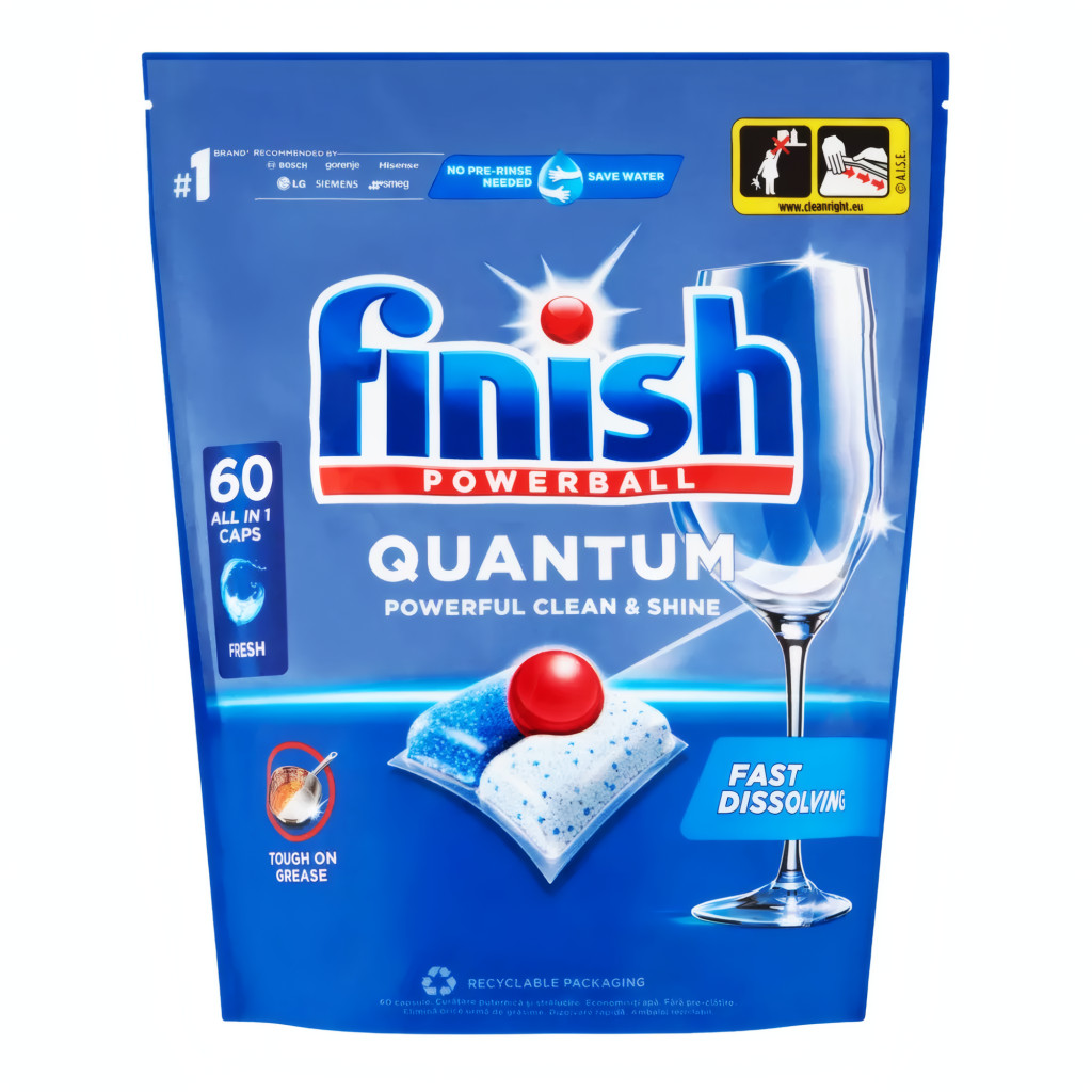Finish Quantum provides superior cleanliness and shine, as well as additional protection against glass corrosion. Finish Powerball washes away residue for a shine, even in the toughest water conditions. Finish Quantum comes in a resealable bag, so there’s no need to unpack individual capsules.