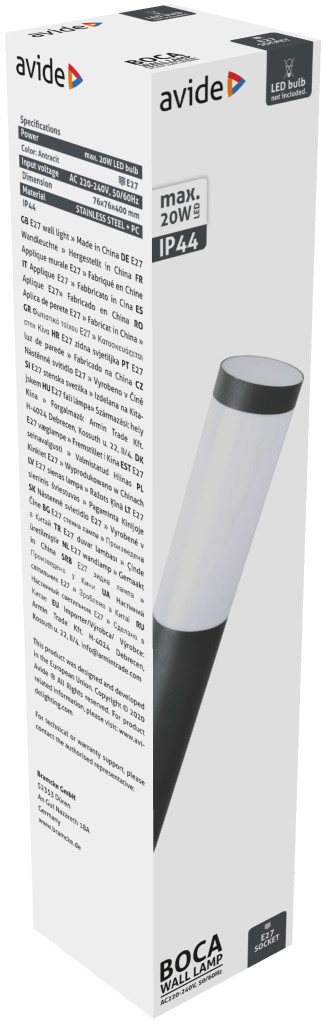Avide outdoor wall lamp is a surface-mounted metal and plastic housing luminaire with E 27 socket and IP44 protection, making it suitable for outdoor use.