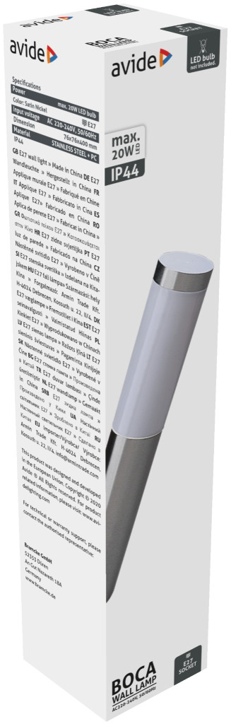 Avide outdoor wall lamp is a surface-mounted metal and plastic housing luminaire with E 27 socket and IP44 protection, making it suitable for outdoor use.
