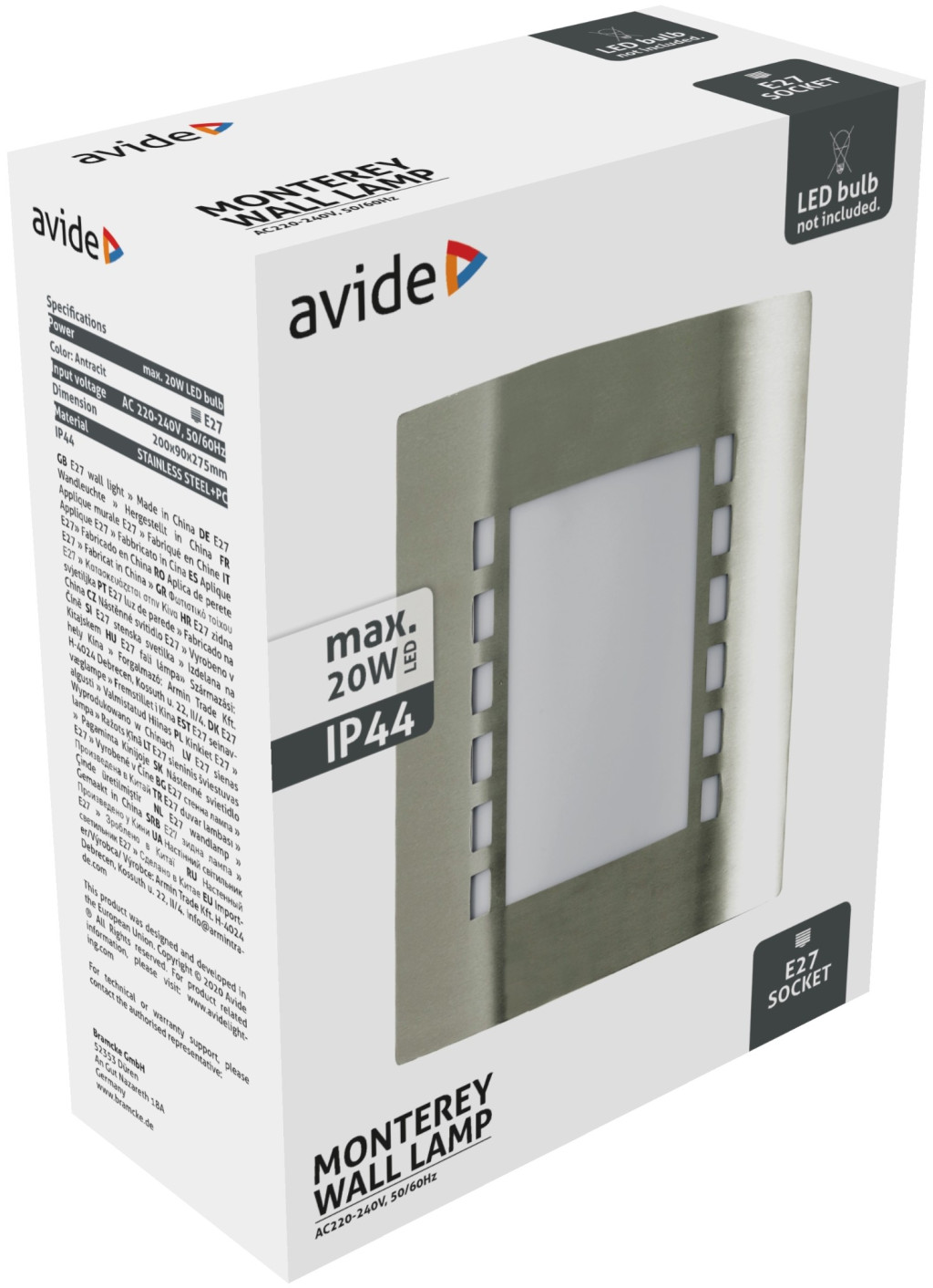 Avide outdoor wall lamp Monterey 1xE27 IP44 Satin Nickel