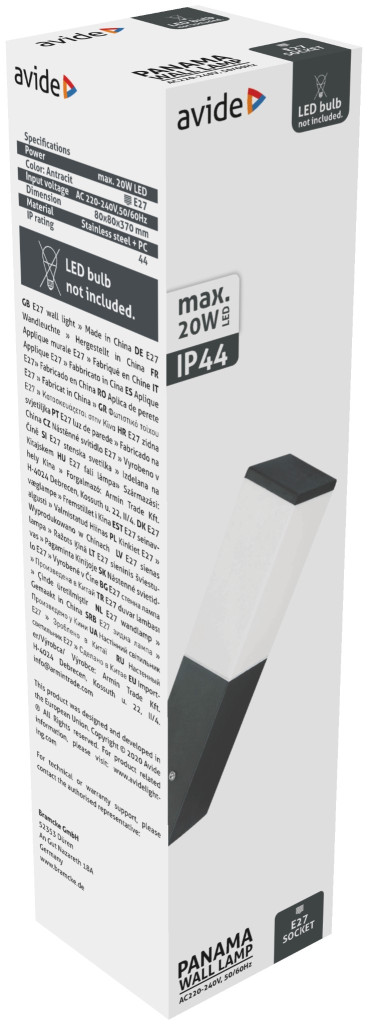 Avide outdoor wall lamp is a surface-mounted metal and plastic housing luminaire with E 27 socket and IP44 protection, making it suitable for outdoor use.