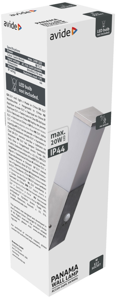 Avide outdoor wall lamp is a surface-mounted metal and plastic housing luminaire with E 27 socket, IP44 protection, making it suitable for outdoor use, with a motion sensor.