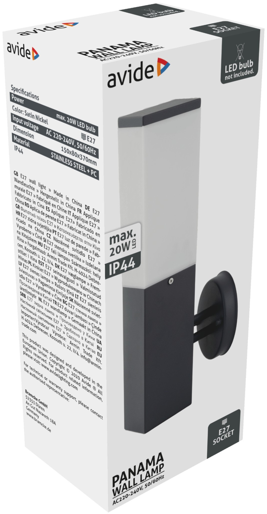 Avide outdoor wall lamp is a surface-mounted metal and plastic housing luminaire with E 27 socket and IP44 protection, making it suitable for outdoor use.