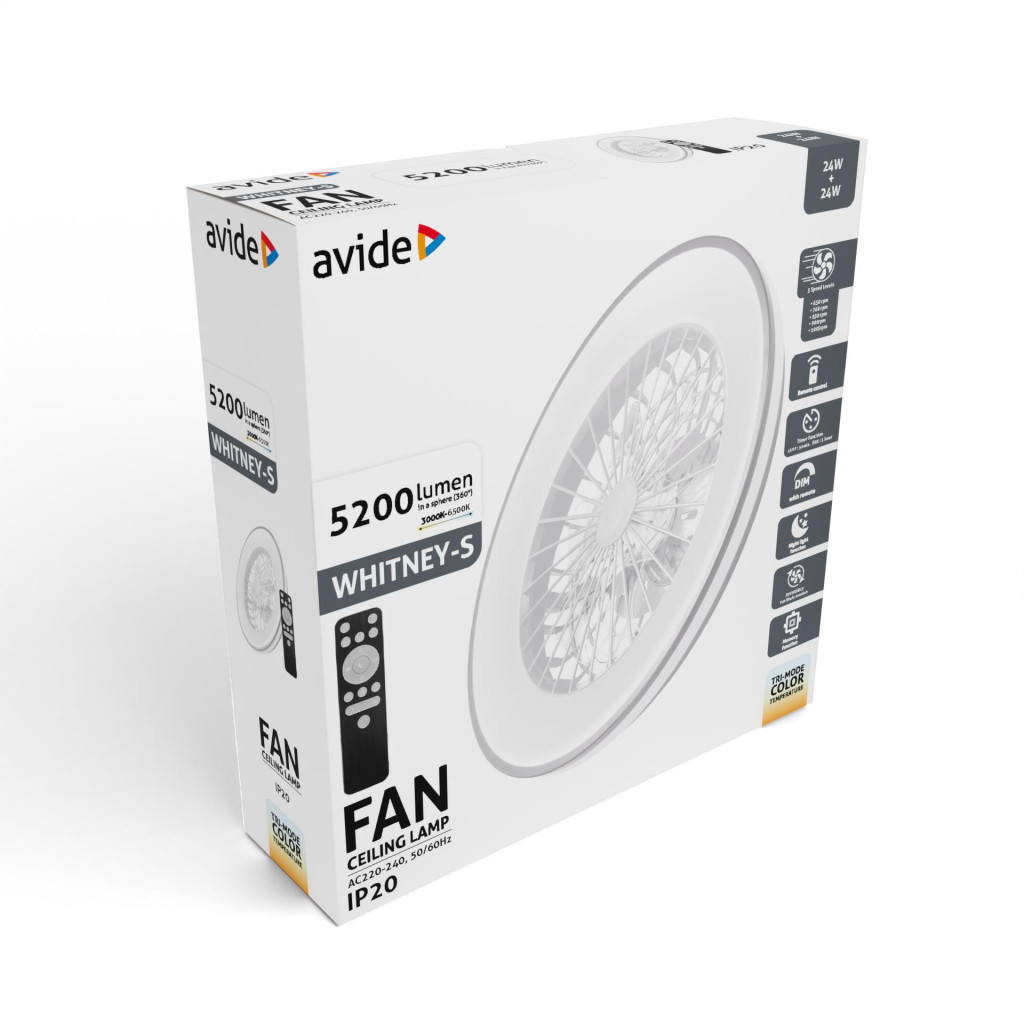Avide Mennyezeti lámpa ventilátorral Whitney ezüst, 2x24W+15W motor, távirányítóval