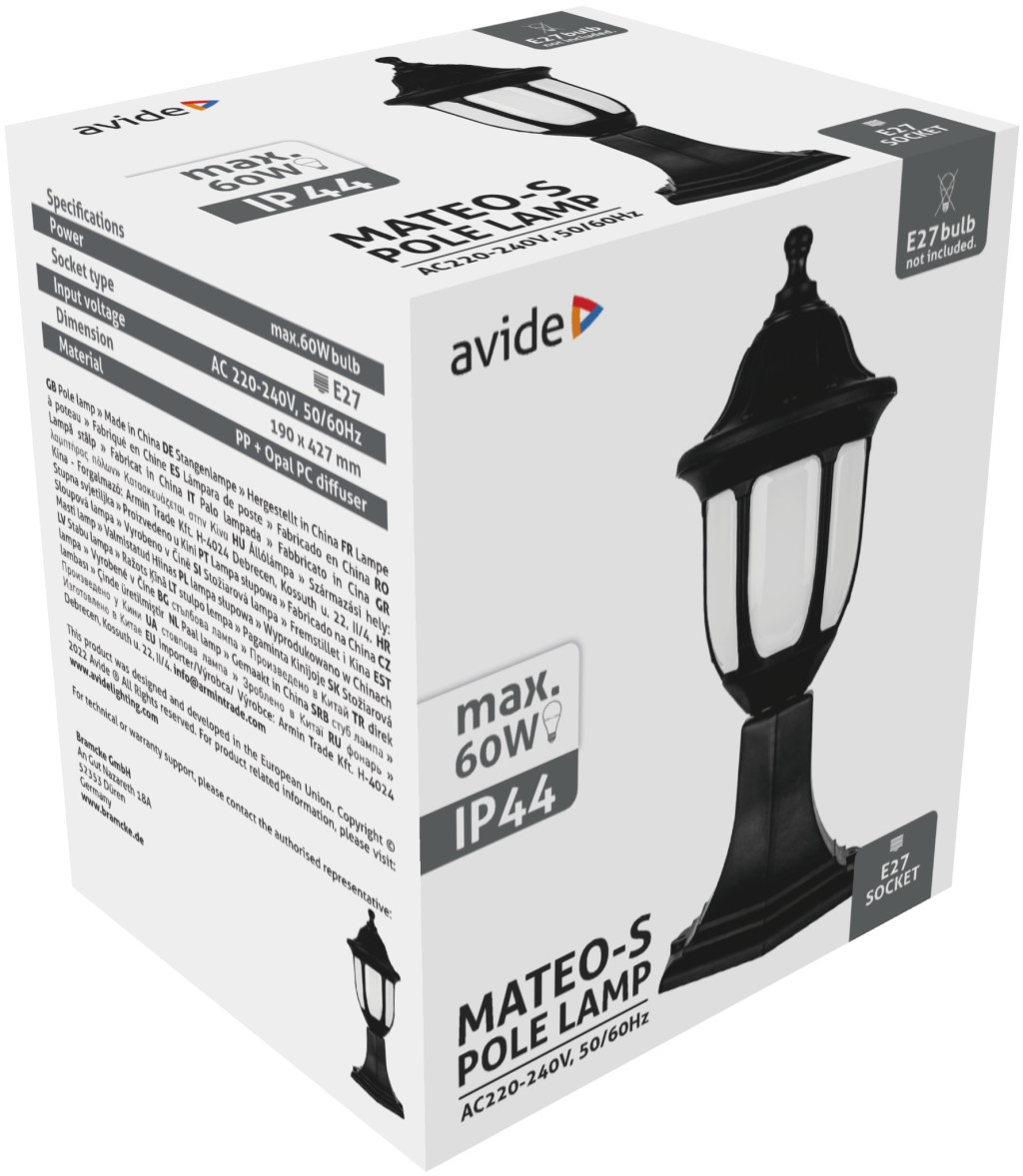 Avide Kültéri Álló Lámpa Mateo-S 430mm 1xE27 Fekete IP44