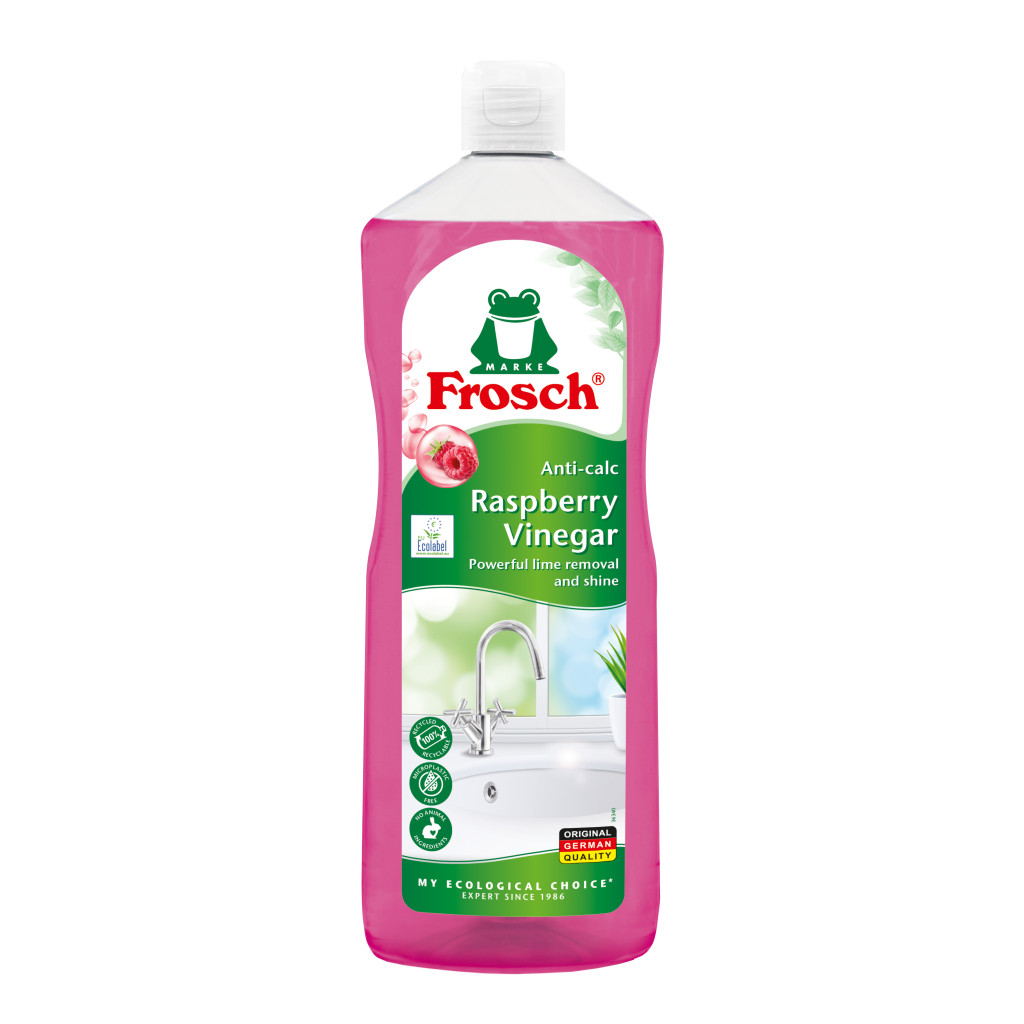 Frosch sredstvo za uklanjanje kamenca s octom od maline 1000 ml učinkovito uklanja kamenac i naslage sapuna s kuhinjskih i kupaonskih površina. Sadržaj octa od maline pomaže kod tvrdokornih nečistoća, uz svjež, voćni miris maline. Pogodno i za pločice*, ostavlja sjaj bez tragova.
