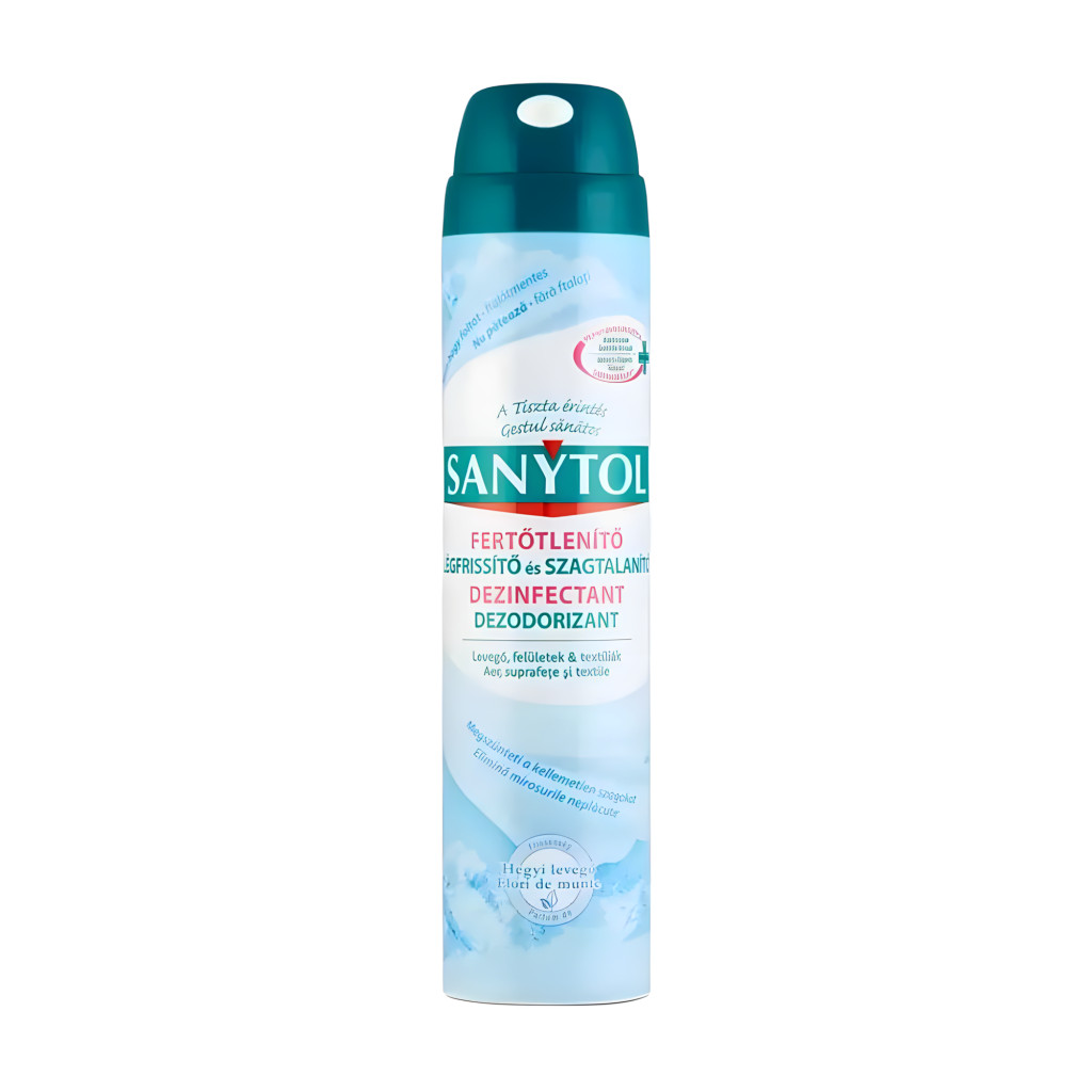 A Sanytol fertőtlenítő légfrissítő hegyi levegő illattal egyszerre biztosít friss illatot és higiénikus környezetet. A spray hatékony a levegőben, felületeken és textíliákon egyaránt, így eltávolítja a baktériumok, gombák és burkos vírusok 99,9 %-át, például a H1N1 influenzavírust.