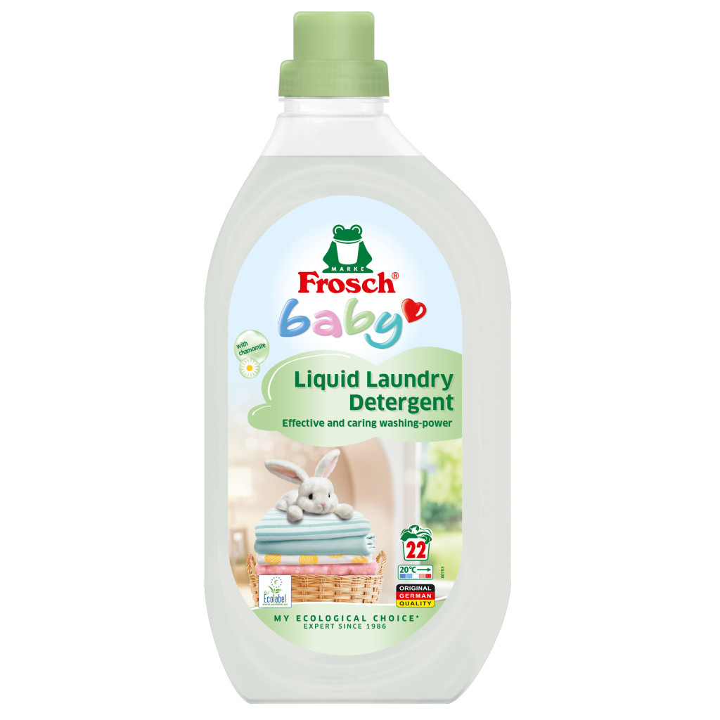 Ekološki, hipoalergen Frosch Baby tečni deterdžent za veš u pakovanju od 1500 ml, dovoljno za oko 21 pranje. Blaga formula sa ekstraktom kamilice, bez konzervansa i dodatnih boja, za nežno pranje bebi odeće i tekstila za osetljivu kožu.
