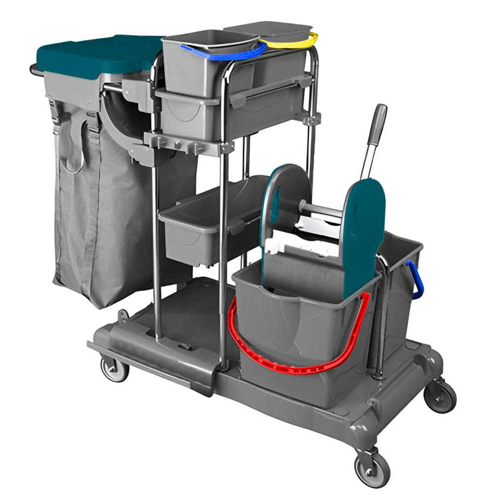 Profesionálny čistiaci vozík (mop cart) na pravidelné upratovanie inštitúcií a administratívnych budov. Ľahko sa presúva vďaka kombinácii plastu a oceľového rámu. Dve 18L vedrá sú ľahko prístupné a postačujúce na čistenie väčších plôch. Pomocou dvoch malých vedier v rôznych farbách nie je problém vyčistiť rôzne priestory (kúpeľňa, kuchyňa a pod.) a kôš na náradie ponúka dostatok miesta na rôzne čistiace prostriedky a náradie. Vďaka držiaku na vrece možno ľahko zbierať odpad.