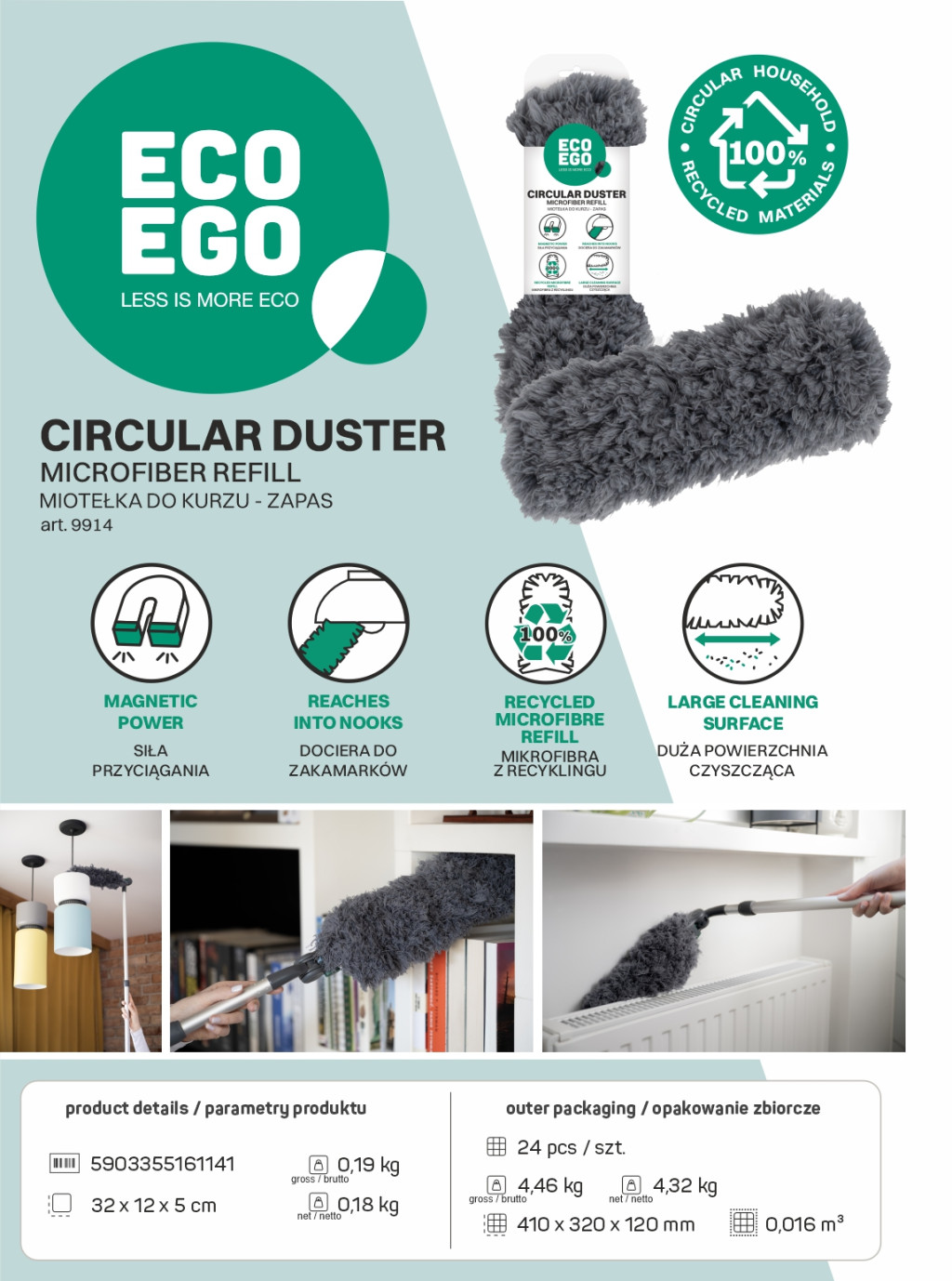 Az EGO ECO Duster könnyű és könnyen kezelhető. Minimális helyet foglal, így könnyen tárolható. A mikroszálas kendő kényelmesen mosógépben mosható (a javaslatoknak megfelelően), ami meghosszabbítja élettartamát és visszaadja frissességét.